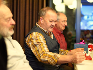 Da wir aber neben feinem Essen auch "Schrottwichteln" im Programmheft hatten, kam schon bei der Abgabe der mitgebrachten Geschenke so etwas wie Weihnachtsgefühl auf. Die gute Stimmung der Eintreffenden und das schöne Umfeld im Sonnenhof versprachen einen lustigen und geselligen Abend.